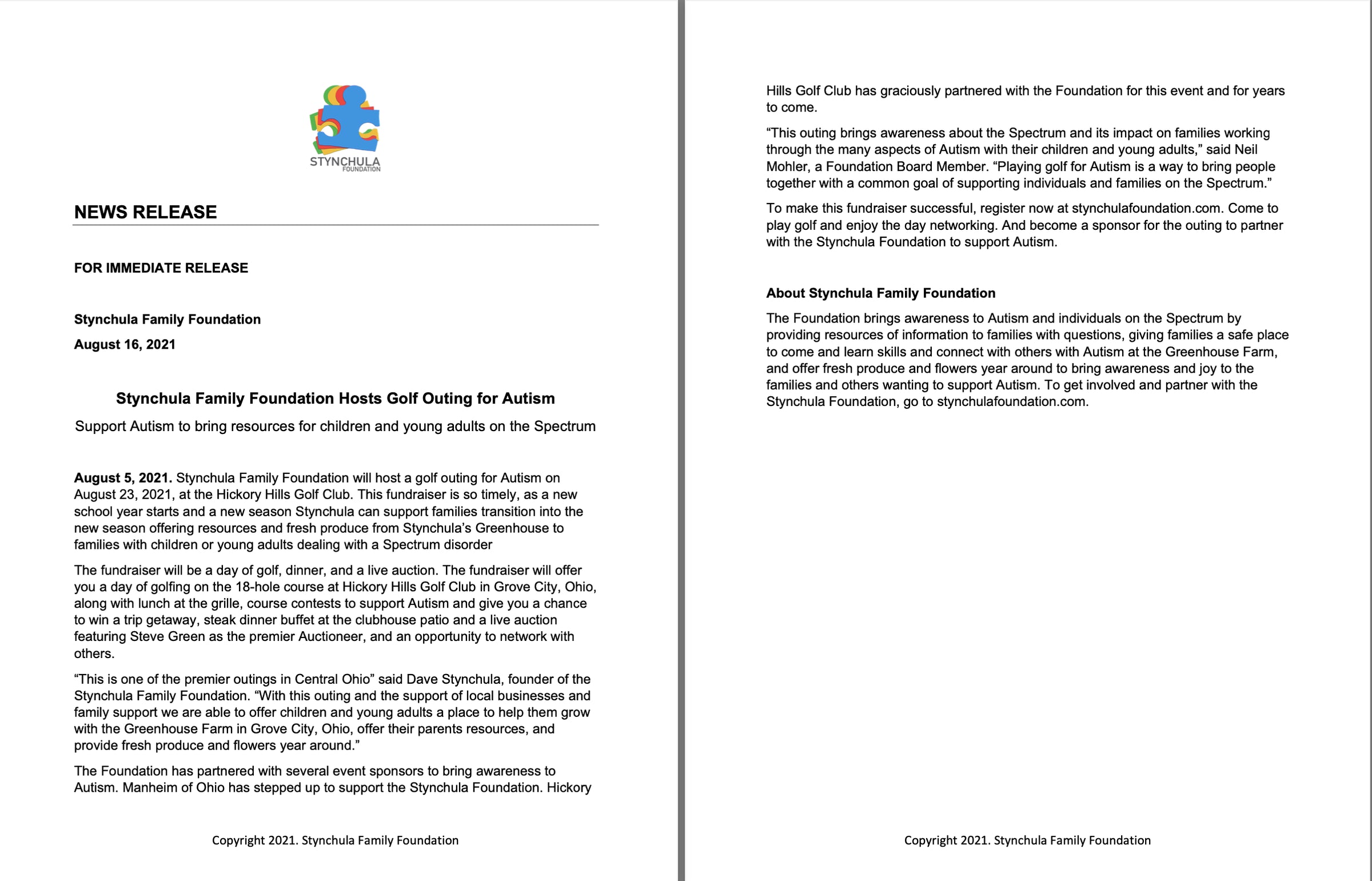 GOLF OUTING FOR AUTISM - 2021 NEWS RELEASE